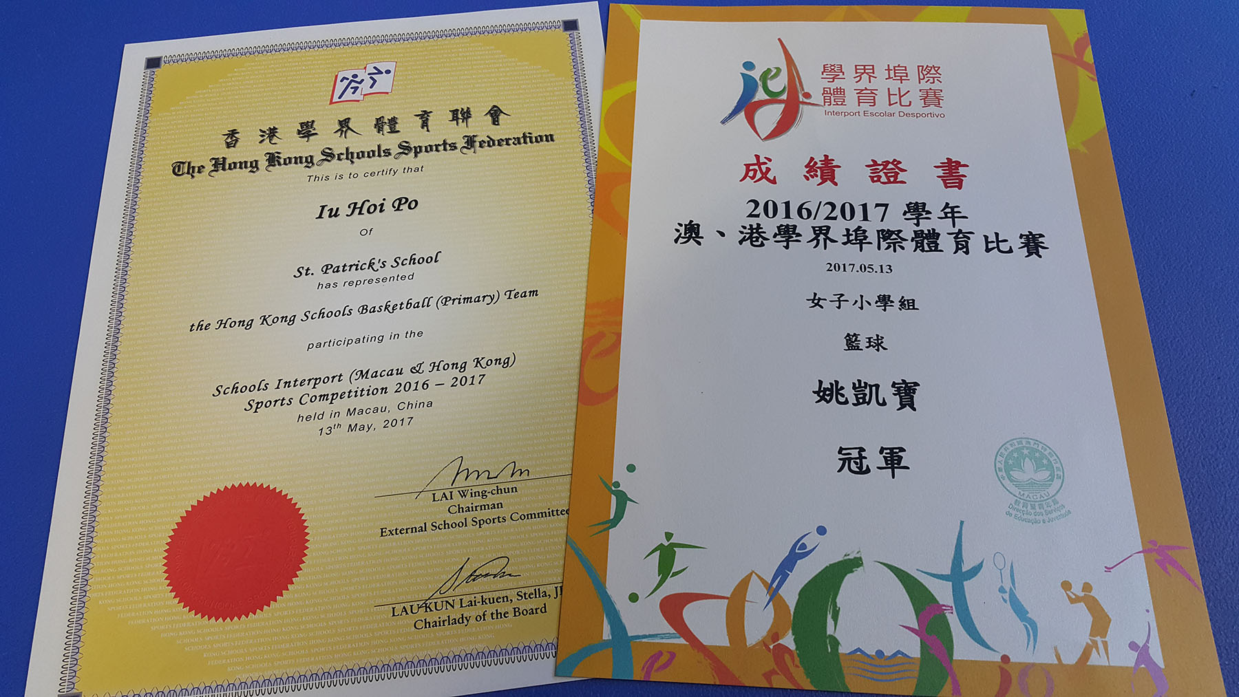 6D 姚凱寶同學成功入選香港學界體育聯會小學生籃球代表隊,並於13-5-2017代表香港出席在澳門舉行之「2016/2017學年 澳、港學界埠際籃球賽」,順利為香港贏取冠軍。